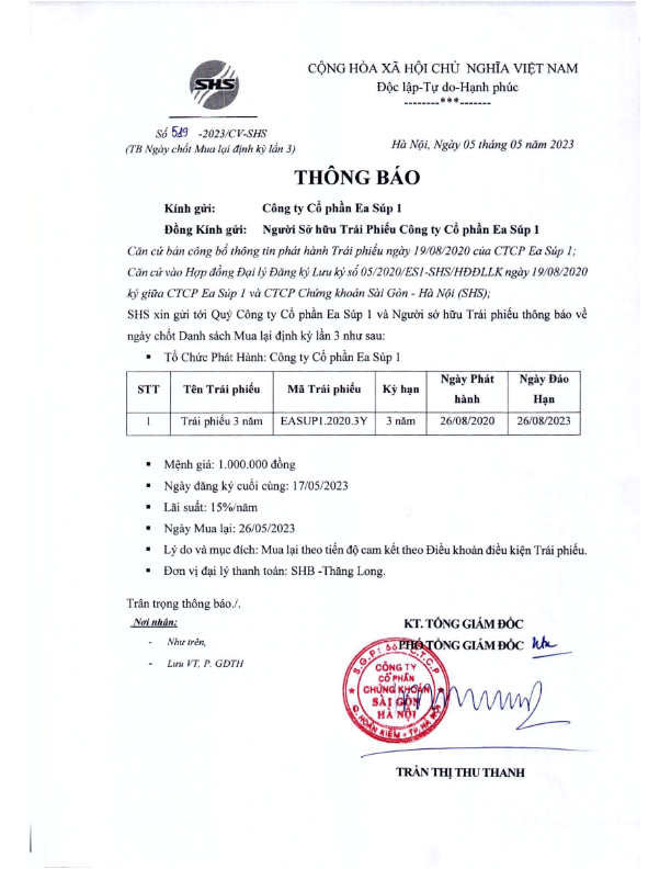 - Thông báo v/v chốt danh sách Người sở hữu Trái phiếu để thực hiện mua lại định kỳ lần 3 Trái phiếu CTCP Ea Súp 3 - 05/05/2023