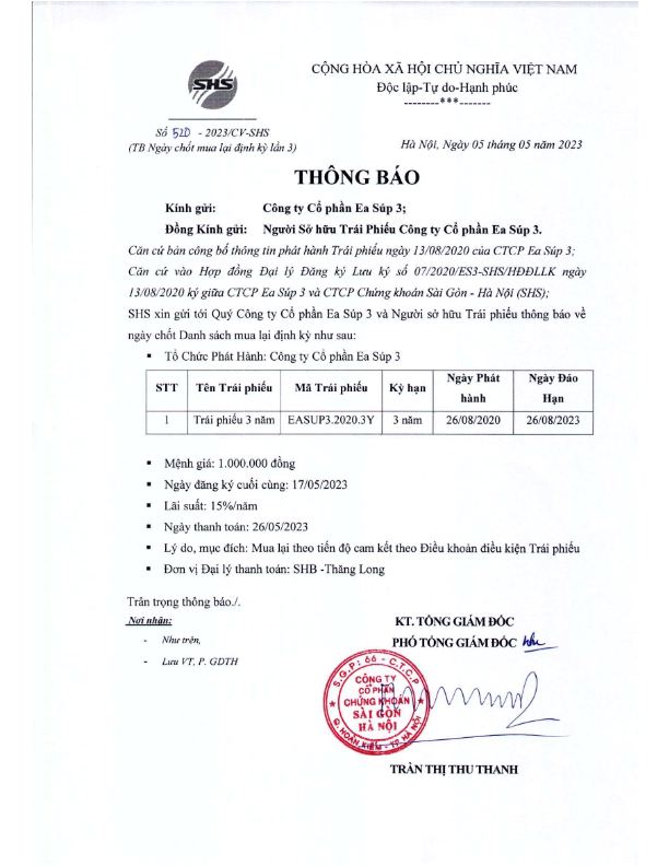 - Thông báo v/v chốt danh sách Người sở hữu Trái phiếu để thực hiện mua lại định kỳ lần 3 Trái phiếu CTCP Ea Súp 1 - 05/05/2023