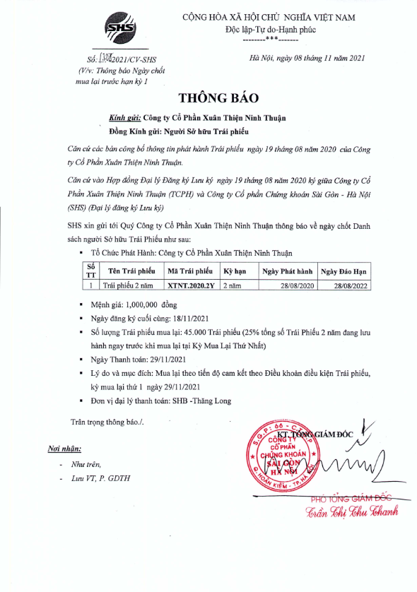 - Thông báo v/v chốt danh sách Người sở hữu Trái phiếu để thực hiện Mua lại trước hạn lần 1 Trái phiếu Công ty Cổ Phần Xuân Thiện Thuận Bắc - 07/11/2021