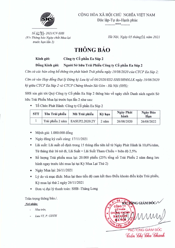 - Thông báo v/v chốt danh sách Người sở hữu Trái phiếu để thực hiện Mua lại trước hạn lần 2 Trái phiếu CTCP Ea Súp 3 - 05/11/2021