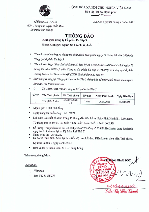 - Thông báo v/v chốt danh sách Người sở hữu Trái phiếu để thực hiện Trả lãi kỳ 5 Trái phiếu CTCP Ea Súp 3 - 05/11/2021