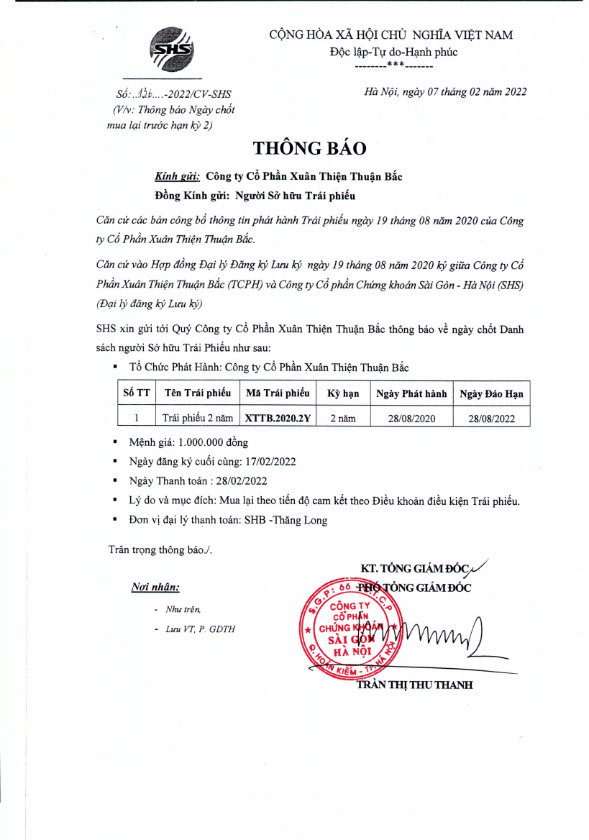 Thông báo v/v chốt danh sách Người sở hữu Trái phiếu để thực hiện Mua lại trước hạn lần 2 Trái phiếu CTCP Xuân Thiện Thuận Bắc