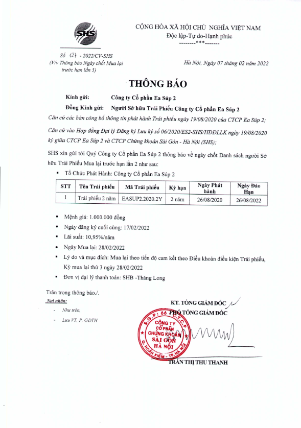 - Thông báo v/v chốt danh sách Người sở hữu Trái phiếu để thực hiện Mua lại trước hạn lần 3 Trái phiếu CTCP Ea Súp 1 - 07/02/2022