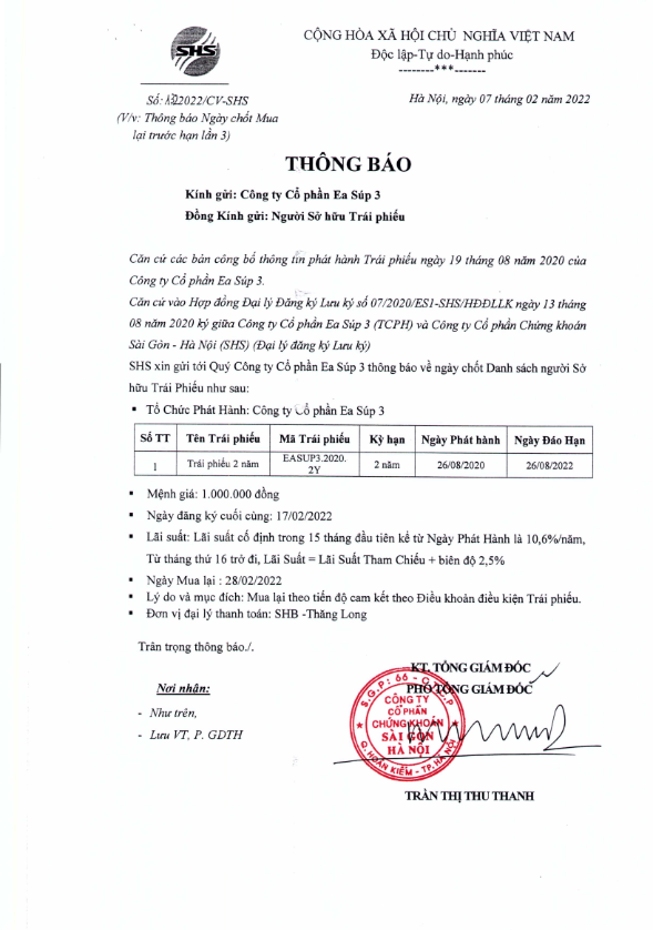 - Thông báo v/v chốt danh sách Người sở hữu Trái phiếu để thực hiện Mua lại trước hạn lần 3 Trái phiếu CTCP Ea Súp 1 - 07/02/2022