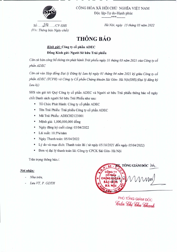Thông báo v/v chốt danh sách Người sở hữu Trái phiếu để thực hiện Trả lãi Công ty cổ phần ADEC