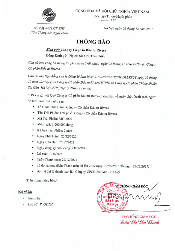 Thông báo v/v chốt danh sách Người sở hữu Trái phiếu để thực hiện Trả lãi Công ty Cổ phần Đầu tư Rivera