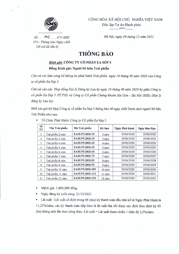 Thông báo v/v chốt danh sách Người sở hữu Trái phiếu để thực hiện Trả lãi Công ty Cổ phần Ea Súp 5