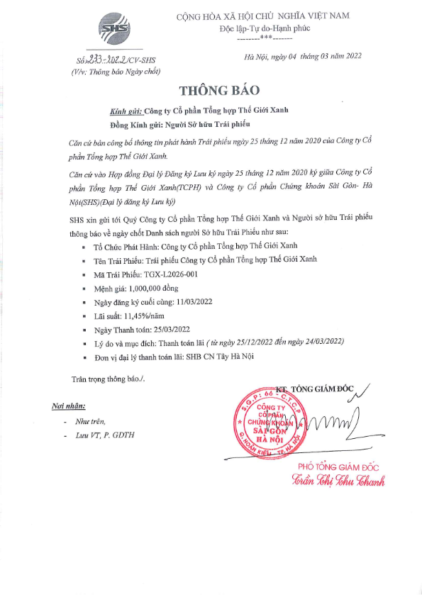 Thông báo v/v chốt danh sách Người sở hữu Trái phiếu để thực hiện Trả lãi Công ty Cổ phần Tổng hợp Thế Giới Xanh