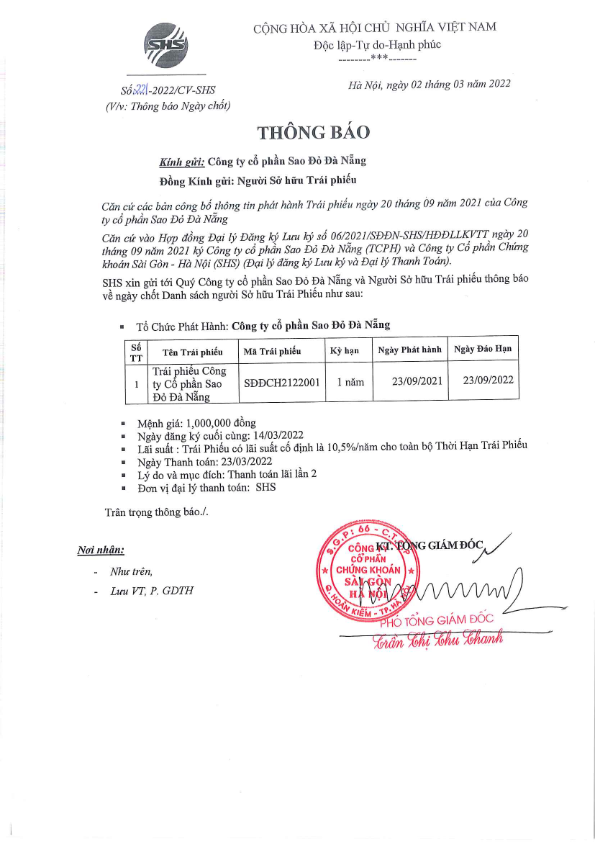 Thông báo v/v chốt danh sách Người sở hữu Trái phiếu để thực hiện Trả lãi CTCP Sao đỏ Đà Nẵng