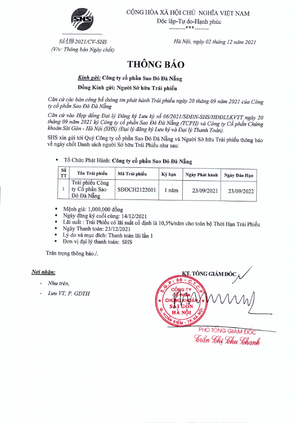 Thông báo v/v chốt danh sách Người sở hữu Trái phiếu để thực hiện Trả lãi CTCP Sao đỏ Đà Nẵng