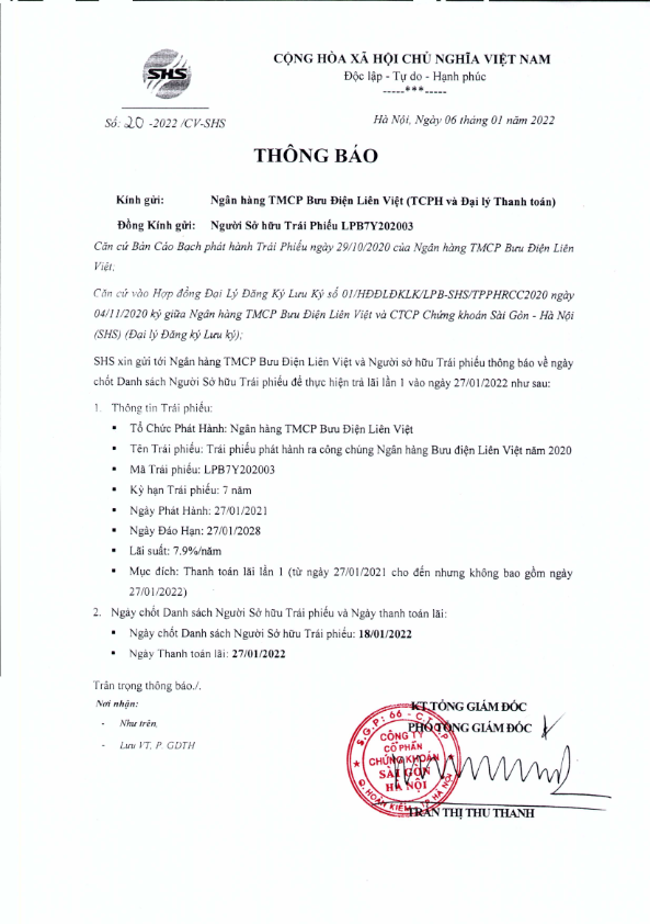 Thông báo v/v chốt danh sách Người sở hữu Trái phiếu để thực hiện Trả lãi kỳ 1 Trái phiếu LPB7Y202003 Công ty cổ phần Ngân hàng TMCP Bưu Điện Liên Việt