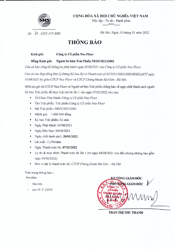 Thông báo v/v chốt danh sách Người sở hữu Trái phiếu để thực hiện Trả lãi kỳ 1 Trái phiếu NEOCH2123001 Công ty cổ phần CTCP Neo Floor