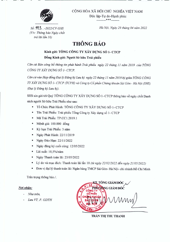 Thông báo v/v chốt danh sách Người sở hữu Trái phiếu để thực hiện Trả lãi kỳ 10 Tổng công ty Xây dựng số 1- CTCP