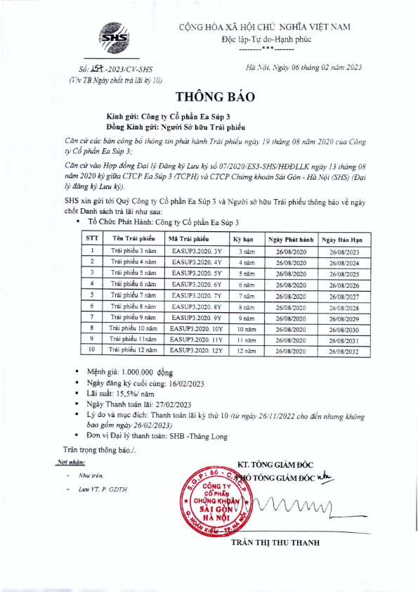 Thông báo v/v chốt danh sách Người sở hữu Trái phiếu để thực hiện Trả lãi kỳ 10 Trái phiếu CTCP Ea Súp 3