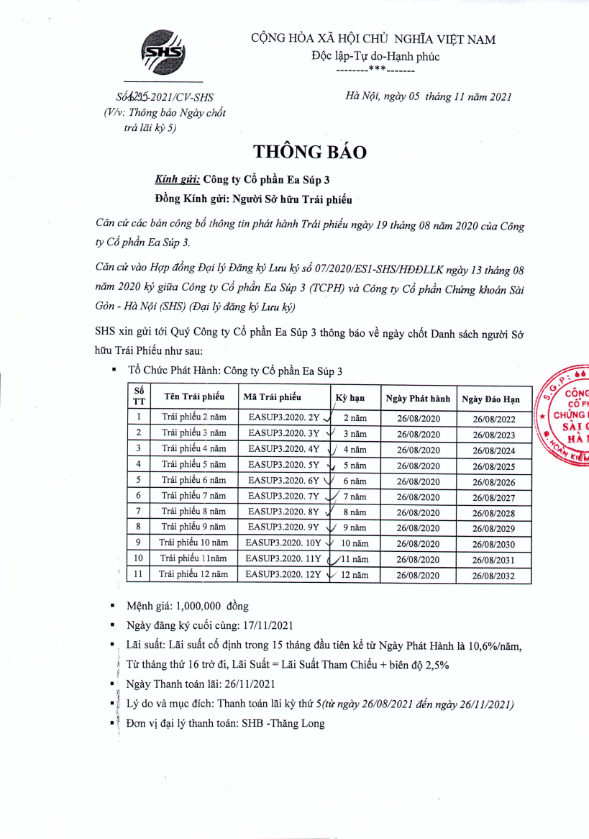 - Thông báo v/v chốt danh sách Người sở hữu Trái phiếu để thực hiện Mua lại trước hạn lần 2 Trái phiếu CTCP Ea Súp 3 - 05/11/2021