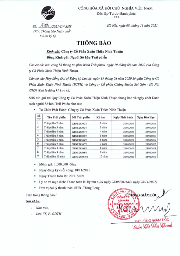 - Thông báo v/v chốt danh sách Người sở hữu Trái phiếu để thực hiện Mua lại trước hạn lần 1 Trái phiếu Công ty Cổ Phần Xuân Thiện Ninh Thuận - 07/11/2021