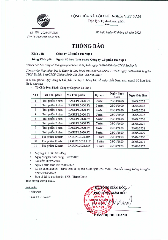 - Thông báo v/v chốt danh sách Người sở hữu Trái phiếu để thực hiện Mua lại trước hạn lần 3 Trái phiếu CTCP Ea Súp 1 - 07/02/2022