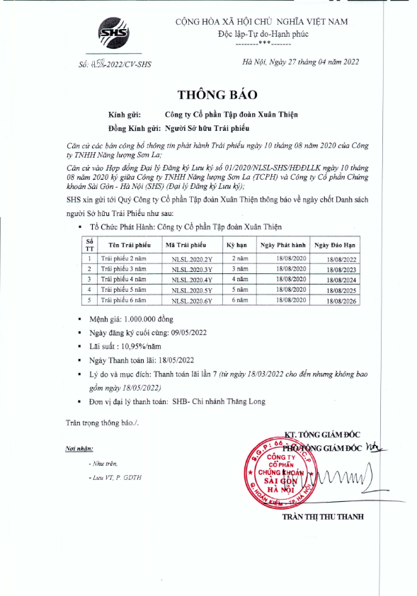 Thông báo v/v chốt danh sách Người sở hữu Trái phiếu để thực hiện Trả lãi kỳ 7 CTCP Tập đoàn Xuân Thiện