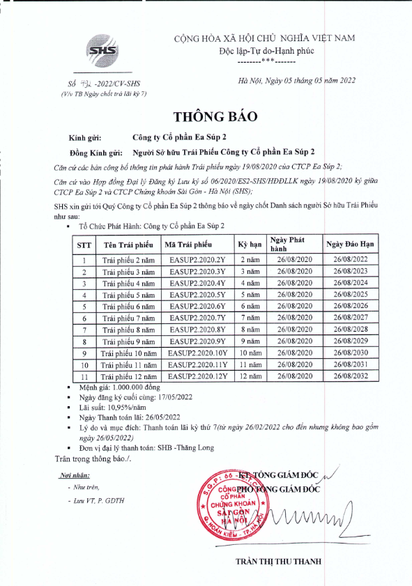 - Thông báo v/v chốt danh sách Người sở hữu Trái phiếu để thực hiện Trả lãi kỳ 7 Trái phiếu Công ty Cổ Phần Ea Súp 1 - 05/05/2022