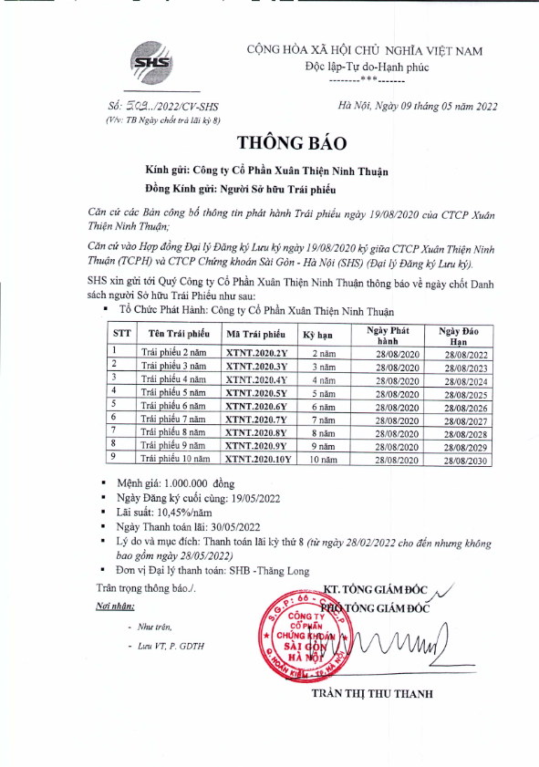 Thông báo v/v chốt danh sách Người sở hữu Trái phiếu để thực hiện Trả lãi kỳ 8 Trái phiếu Công ty Cổ Phần Xuân Thiện Ninh Thuận