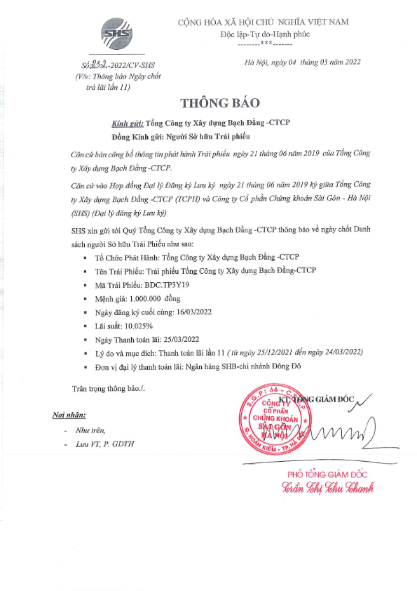 Thông báo v/v chốt danh sách Người sở hữu Trái phiếu để thực hiện Trả lãi Tổng Công ty Xây dựng Bạch Đằng