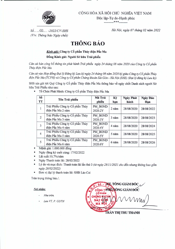 Thông báo v/v chốt danh sách Người sở hữu Trái phiếu để thực hiện Trả lãi Trái phiếu CTCP Thủy Điện Pắc Ma