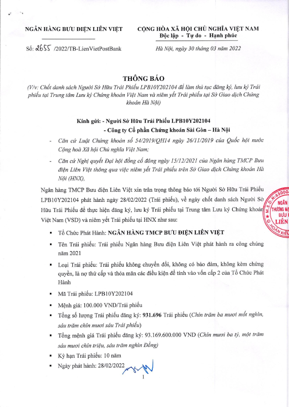 - Thông báo v/v chốt danh sách Người sở hữu Trái phiếu LPB7Y202103 để làm thủ tục đăng ký, lưu ký TP tại Trung tâm lưu ký chứng khoán Việt Nam và niêm yết tại Sở giao dịch chứng khoán Hà Nội - 30/03/2022
