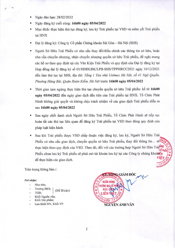 - Thông báo v/v chốt danh sách Người sở hữu Trái phiếu LPB7Y202101 để làm thủ tục đăng ký, lưu ký TP tại Trung tâm lưu ký chứng khoán Việt Nam và niêm yết tại Sở giao dịch chứng khoán Hà Nội - 30/03/2022