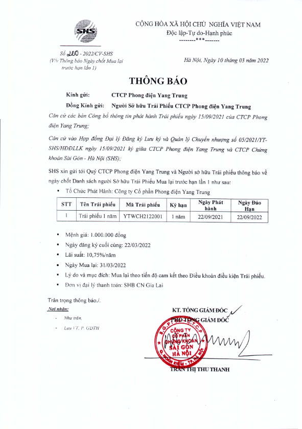 Thông báo v/v chốt danh sách Người sở hữu Trái phiếu Mua lại trước hạn lần 1 CTCP Phong điện Yang Trung