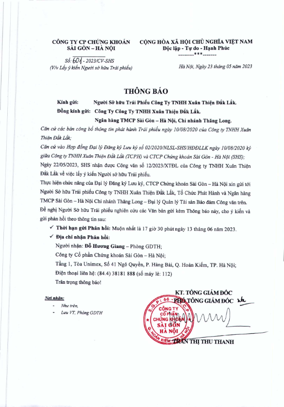 - Thông báo v/v lấy ý kiến Người sở hữu Trái phiếu Công Ty Cổ Phần Tập Đoàn Xuân Thiện - 22/05/2023