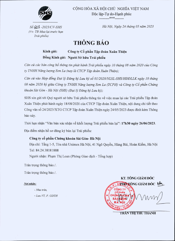 Thông báo v/v Mua lại TH Trái phiếu Công Ty Cổ Phần Tập Đoàn Xuân Thiện