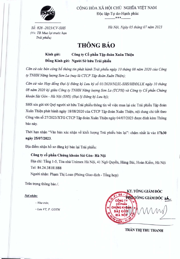 Thông báo v/v mua lại trước hạn theo yêu cầu của Công ty Cổ phần Tập đoàn Xuân Thiện