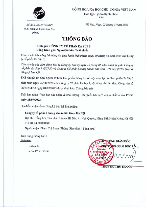 - Thông báo v/v mua lại trước hạn theo yêu cầu của CTCP Ea Súp 3 - 04/07/2023