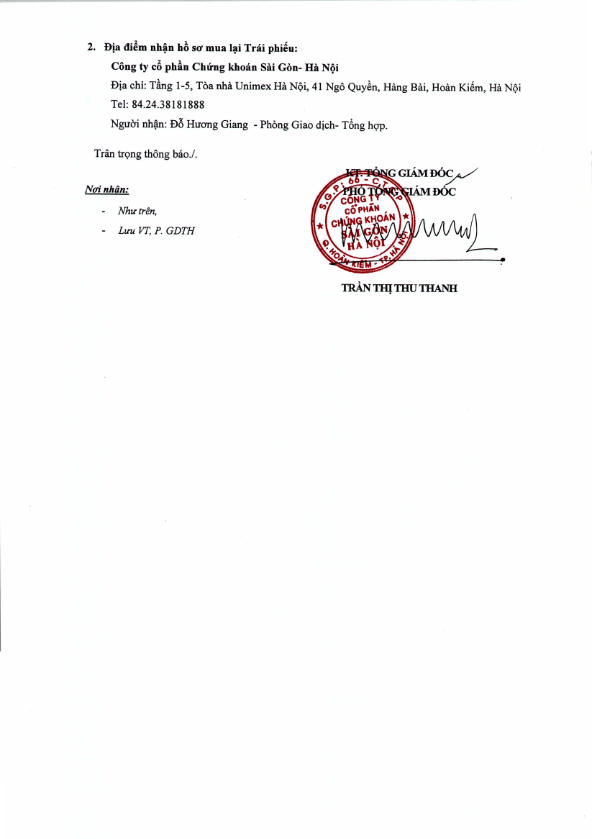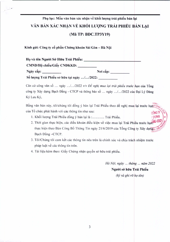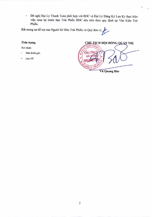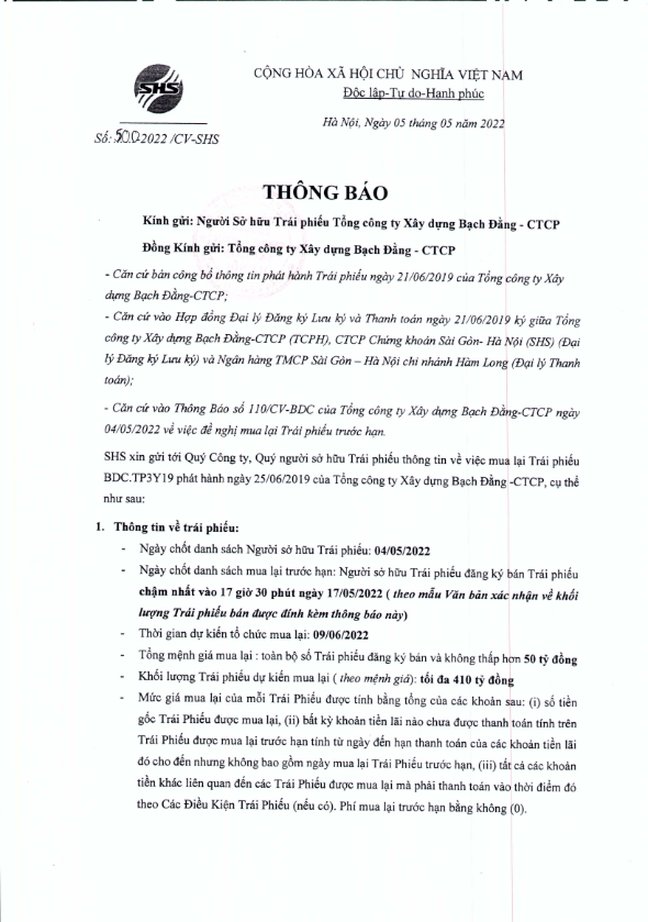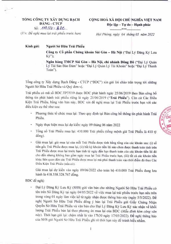 Thông báo v/v mua lại trước hạn TP Tổng công ty Xây dựng Bạch Đằng - CTCP