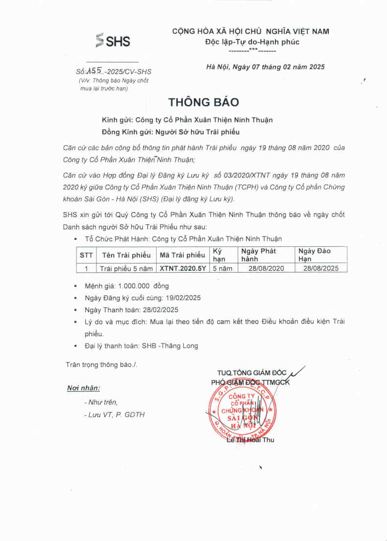 Thông báo v/v Mua lại trước hạn Trái phiếu Công ty Cổ Phần Xuân Thiện Ninh Thuận.