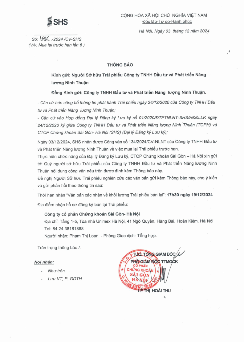 - Thông báo v/v Mua lại trước hạn Trái phiếu Công ty Cổ phần Công nghiệp Năng lượng Ninh Thuận - 28/11/2024