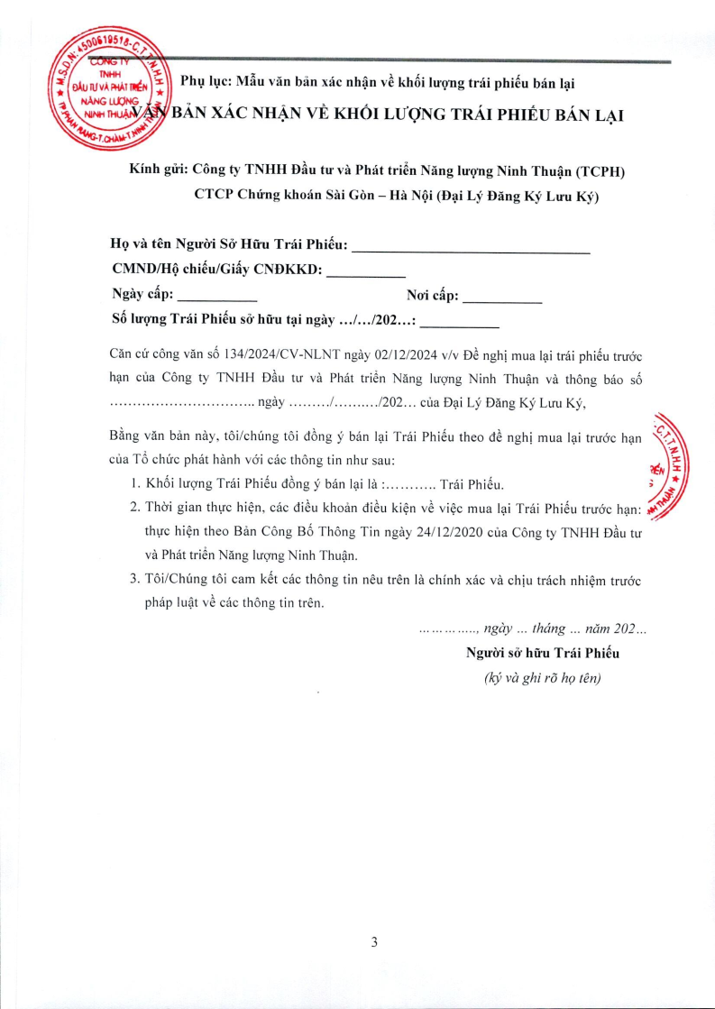 Thông báo v/v Mua lại trước hạn Trái phiếu Công ty TNHH Đầu tư và Phát triển Năng lượng Ninh Thuận