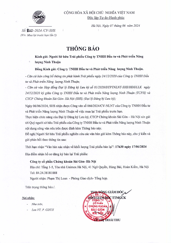 - Thông báo v/v Mua lại bổ sung trước hạn Trái phiếu Công ty Cổ phần Công nghiệp Năng lượng Ninh Thuận - 06/06/2024