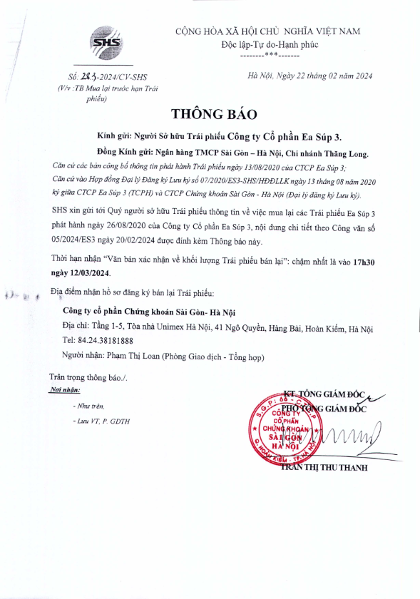 - Thông báo v/v Mua lại trước hạn Trái phiếu CTCP Ea Súp 5 - 21/02/2024