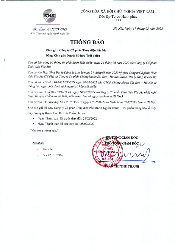 - Thông báo v/v chốt danh sách Người sở hữu Trái phiếu để thực hiện Mua lại trước hạn lần Trái phiếu CTCP Thuỷ điện Pắc Ma - 10/02/2022