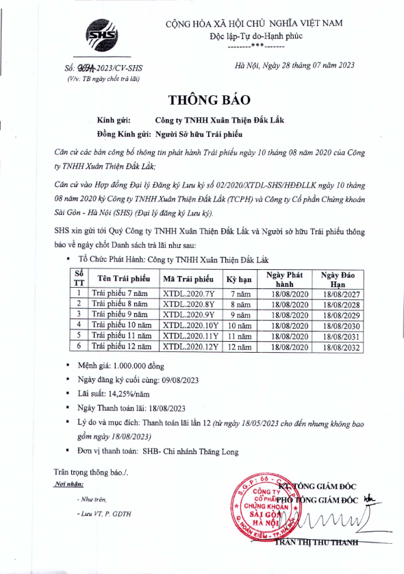 Thông báo v/v Trả lãi định kỳ lần 12 Trái phiếu Công ty TNHH Xuân Thiện Đắk Lắk