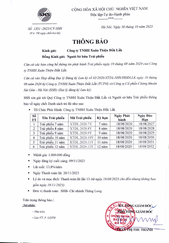 Thông báo v/v Trả lãi định kỳ lần 13 Trái phiếu Công ty TNHH Xuân Thiện Đắk Lắk