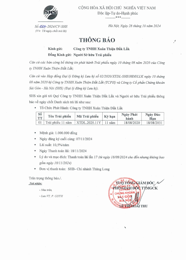Thông báo v/v Trả lãi định kỳ lần 17 Trái phiếu Công ty TNHH Xuân Thiện Đắk Lắk