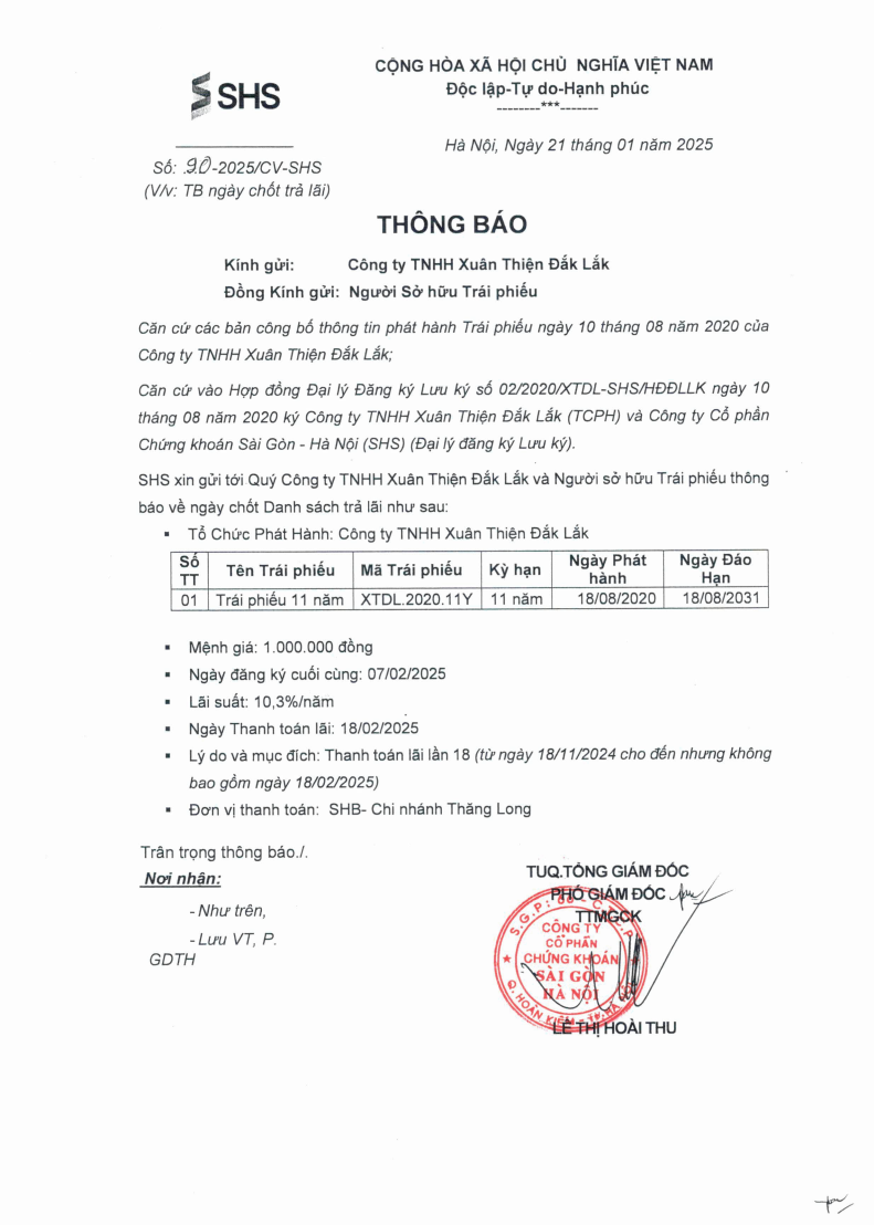 Thông báo v/v Trả lãi định kỳ lần 18 Trái phiếu Công ty TNHH Xuân Thiện Đắk Lắk