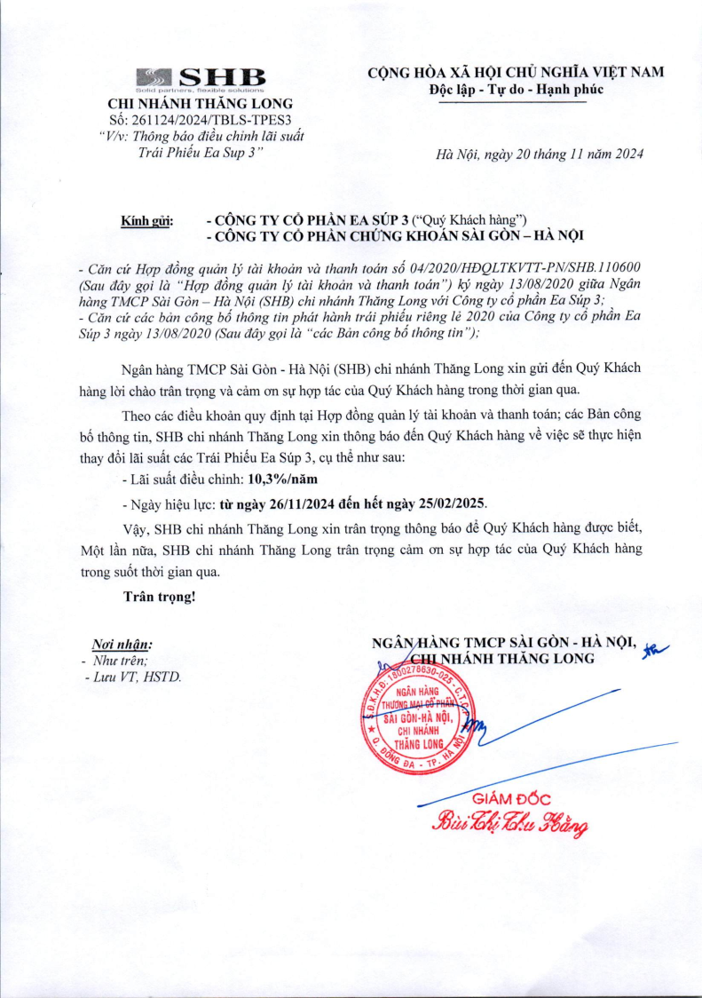 - Thông báo v/v Trả lãi định kỳ Trái phiếu Công ty Cổ phần Ea Súp 1 - 24/11/2024