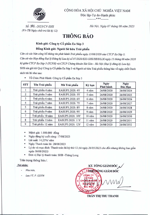 - Thông báo v/v Trả lãi định kỳ Trái phiếu Công ty Cổ phần Ea Súp 1 - 06/08/2023