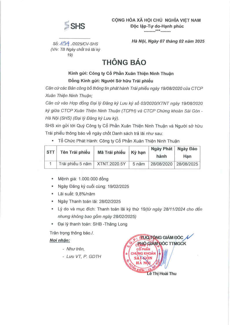 Thông báo v/v Trả lãi định kỳ Trái phiếu Công ty Cổ Phần Xuân Thiện Ninh Thuận.