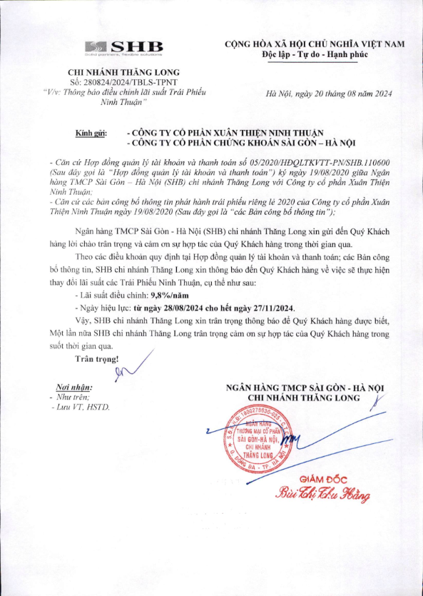 - Thông báo v/v điều chỉnh lãi suất Trái phiếu Công ty TNHH Xuân Thiện Đắk Lắk - 13/08/2024