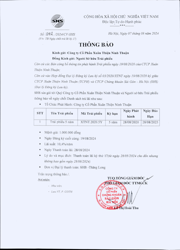 Thông báo v/v Trả lãi định kỳ Trái phiếu Công ty Cổ Phần Xuân Thiện Ninh Thuận