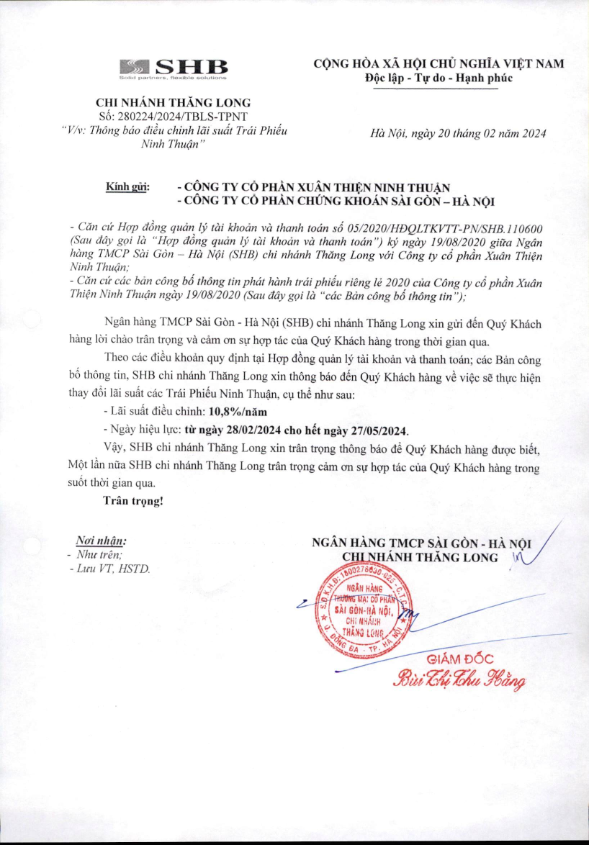 - Thông báo v/v Trả lãi định kỳ Trái phiếu CTCP Xuân Thiện Ninh Thuận - 07/02/2024